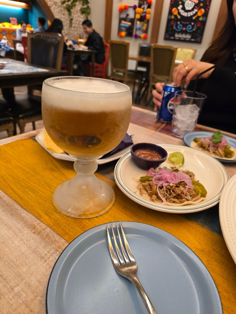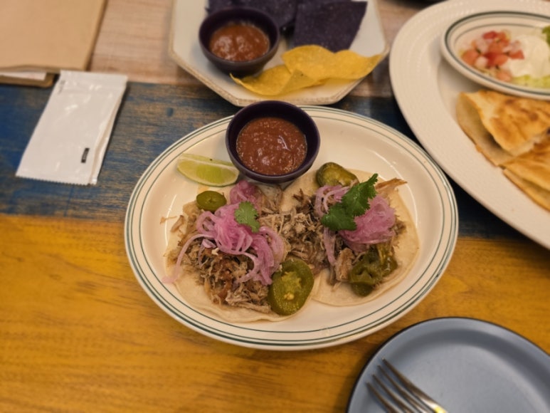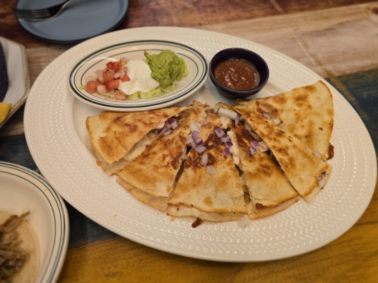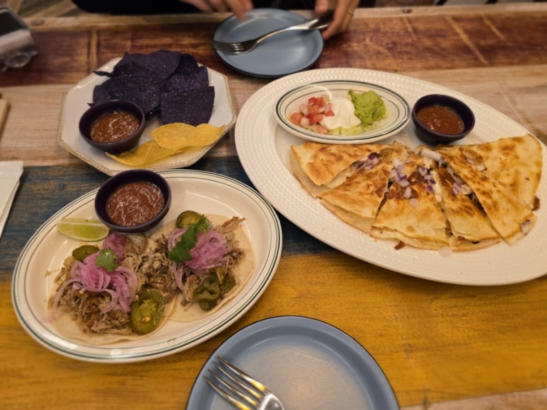 타코 한 입, 퀘사디아 한 입, 그리고 맥주 한 모금! 조합이 완벽해 스트레스까지 날아가는 느낌이에요.🍻