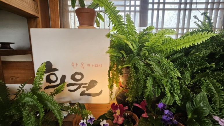 ‘희원’은 전통 한옥 건물을 그대로 활용한 카페예요. 고즈넉한 기와지붕, 나무 기둥, 돌담, 항아리들이 자연스럽게 어우러져 있어, 마치 조선시대 고택에 들어선 듯한 분위기예요.
