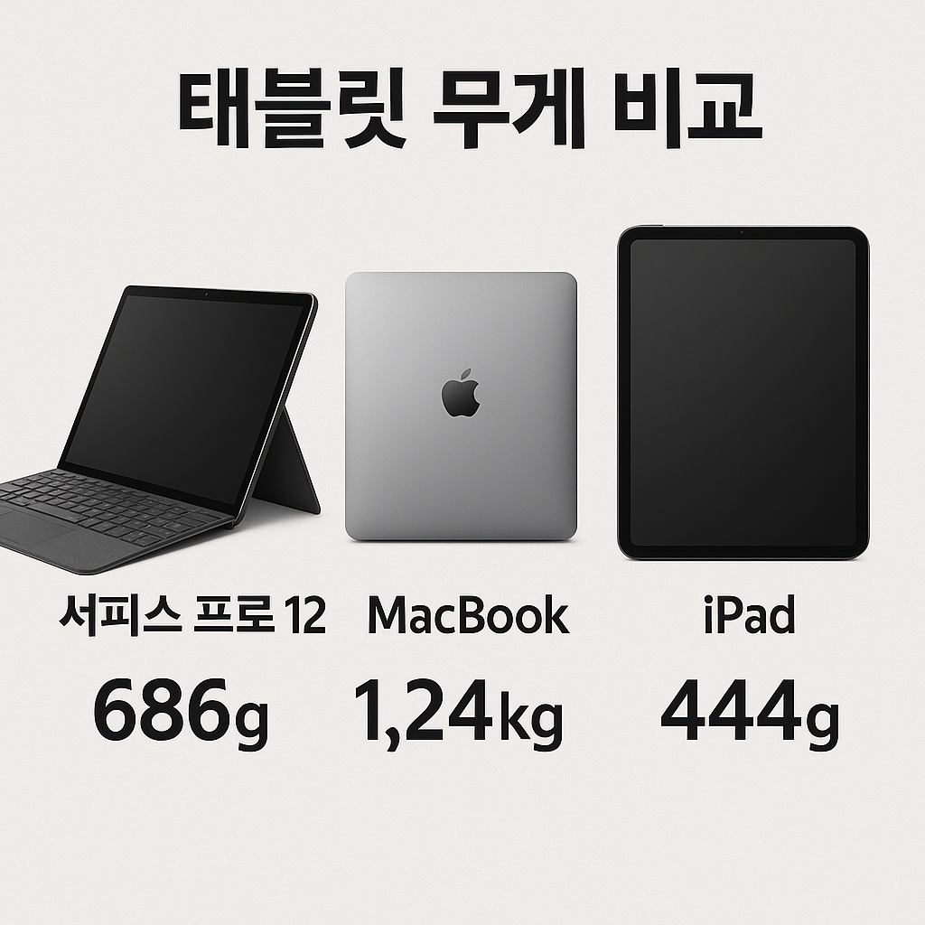 💡 해석: 아이패드보다 무겁지만, 노트북보다 훨씬 가볍고 윈도우 기반이란 점에서 생산성과 이동성의 절묘한 균형을 이룬 제품.