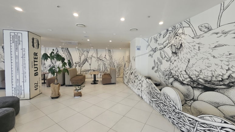 카페 내부는 높은 층고와 통유리 덕분에 채광이 풍부하고, 공간 자체가 하나의 포토 스팟이에요. 한쪽 벽면은 먹선 드로잉 스타일의 식물 일러스트로 꾸며져 있어 전시회에 온 듯한 감성을 줍니다. 자연광이 어우러진 사진은 어떤 필터보다 예쁘게 나와요. SNS 감성샷은 여기서 해결!