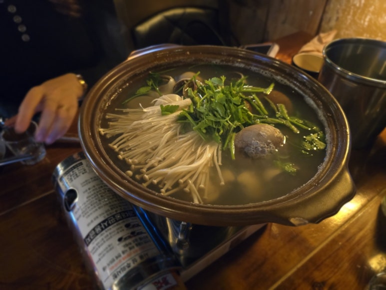 해당 메뉴는 2만 원 중후반대 가격이었고, 양은 2명이 먹기에도 부족했습니다. 구성은 골뱅이, 조개, 버섯, 미나리 정도였고, 특히 골뱅이 상태가 좋지 않아 만족도는 매우 낮았어요.