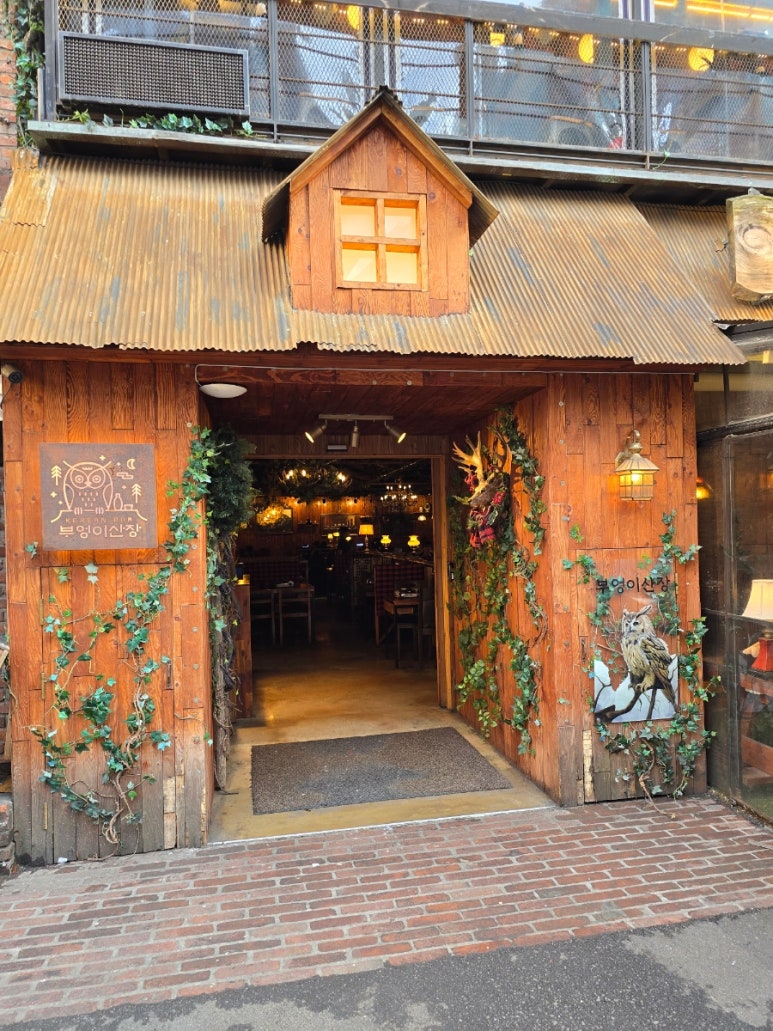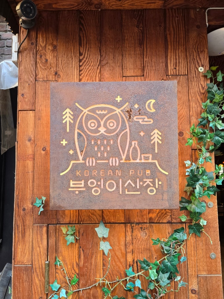 나무 소재의 외벽, 귀여운 부엉이 간판, 살짝 어두운 조명이 어우러져 마치 숲속 오두막에 온 듯한 느낌이에요. 가을·겨울 시즌에는 특히 더 감성이 배가 될 듯한 분위기! 친구나 연인과 조용히 술 한잔 나누기 참 좋은 장소예요.